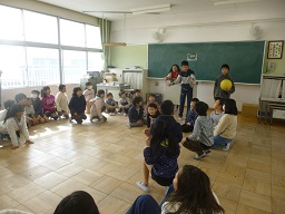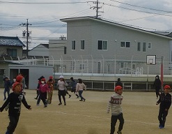 写真はなかよしタイムの様子です。1年生から6年生が、同じ班の中で楽しそうに鬼ごっこをしたり、風船バレーボールをしたりしています。元気な声が至るところから聞こえてきました。