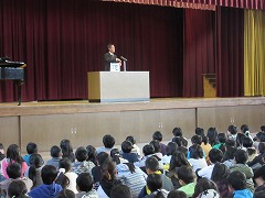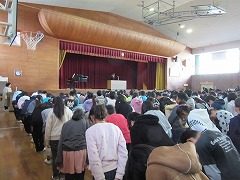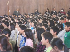 次に、校長先生はこの75日間の様々な出来事を振り返られました。秋見つけ、給食、社会見学、ドリームマップ、野外活動、修学旅行、クリスマス会などを通して、南小の子たちの成長をたくさん見つけることができたと話されました。また、雨の日に結露した廊下を、誰からともなく拭き始め、たくさんの子が参加した出来事を伝え、南小は自慢の学校だと言われました。