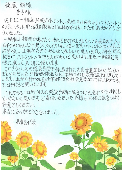 子どもたちの健康管理・体力づくりに生かしていきたいと思います。子どもたちと大切に使わせていただきます。誠にありがとうございました。