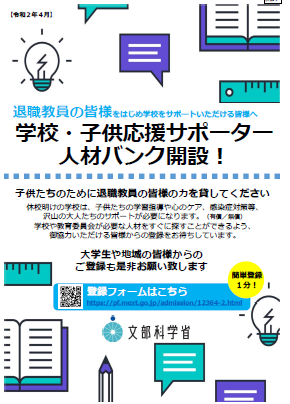 本日より学生ボランティアの方にお越しいただき、甚目寺南小学校の子どもたちのために活動していただいています。上記チラシにあります人材バンク(文部科学省開設)に登録してくださった学生さんです。