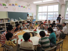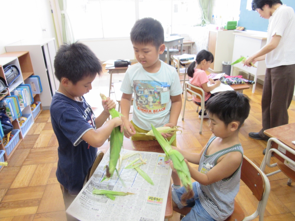 みどり組では、2時間目に夏休みの間に育ったトウモロコシとスイカを食べていました。皮をむき、家庭科室でゆでたトウモロコシと、先週から冷やしておいたスイカをおいしそうにほおばっていました。スイカは真っ赤でよく熟していて、おかわりをする子もいるほどでした。