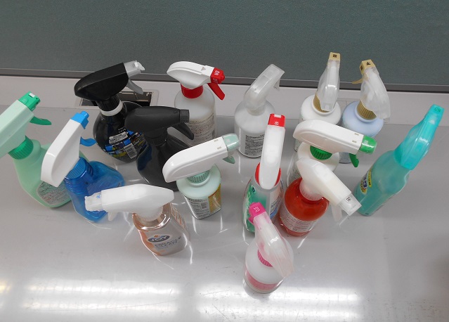 消毒用エタノールについてはヒル・プリント株式会社様より無償で譲渡いただきました。スプレー容器については、ホームセンターなどに問い合わせても1月以上入荷がありませんとのことでした。そのため、学校では先生方にお願いし、各家庭で空になった容器を提出いただいています。