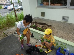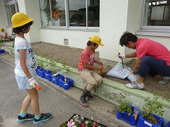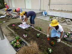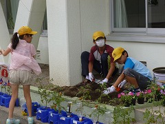 「計画した苗を植えてください。植え方は自分たちで考えていいよ。」担当の先生からレイアウトを任された委員の子たちは、ペチュニアやベゴニアの苗のポットを花壇にバランスよく配置していき、スコップで植えていきました。西の2年生教室前では、「校舎側の方がいいんじゃない?」「離れた方が、雨が当たっていいって!」と、いろんな条件を考えて、植える場所を決めていました。新しくなった花壇は委員の子どもたち作です。機会があったら見てあげてくださいね。