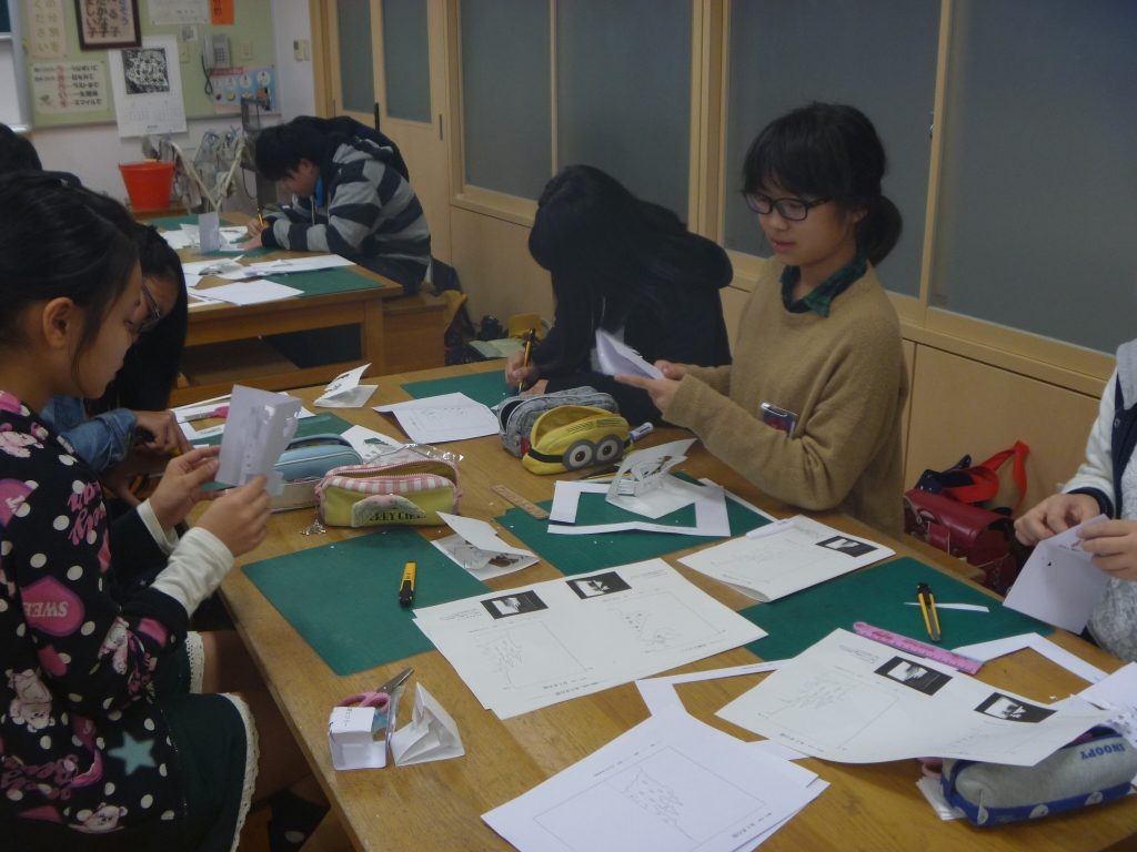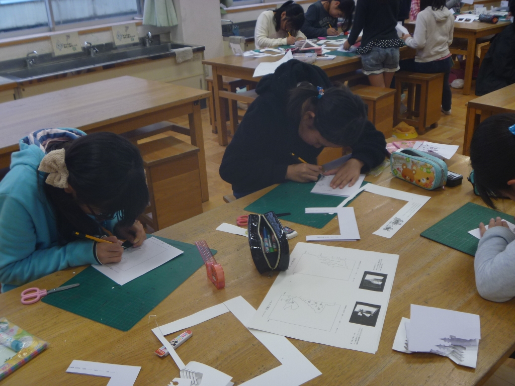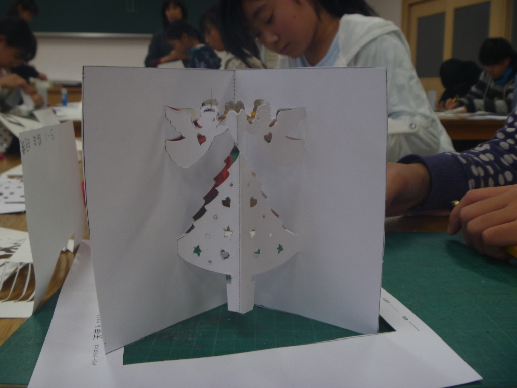 今日は、切り絵クラブの様子をのぞいてみました。今日の課題は立体切り絵です。子どもたちは、カッターを持ち、先生からもらった用紙に、ていねいに切れ目を入れたり、切り抜きを行ったりしました。数ミリのハートやトナカイの目までカッターを入れ、折り目を入れれば、かわいいクリスマスツリーやお城の完成です。(練習用のカニもありました。)わずか45分という時間ですが、集中して仕上げてしまうところはさすが高学年だな、と感じました。