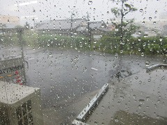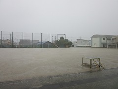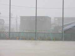 下校後の運動場はびしょびしょ・・・。 雨が斜めに降っていました。