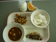 19日の給食は、ご飯、豆腐の味噌汁、サワラの香味焼き、五目煮豆、デコポンでした。
