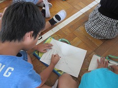 手前の物と奥の物を重ね、奥ほど小さく描く遠近法は、多くの子が描いたことがあります。しかし、遠くの1点(消失点)から広がるこの技法は初めてという子が多いようです。「四角を描けばいいよね。」とある男の子。むむ、なかなかの出来映えです。廊下の奥行きがよく伝わってきます。一方、「難しいもん・・・。」とつぶやく子の絵を見ると、教室の入口が斜めにゆがんで見えます。が、頑張ってね・・・。この経験を重ね、技術を身につけ、やがて作品展の絵を描くのでしょうか?