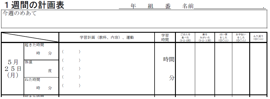 上の資料は、課題配付時にお渡ししている計画表(低学年・中学年・高学年で様式が違います)です。