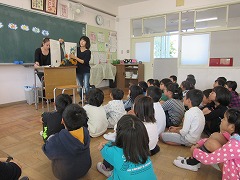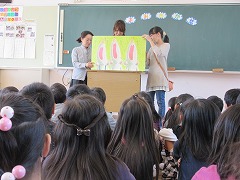 授業参観の日の3時間目に、2年生に向けてPTA図書委員のお母さん方から読み聞かせがありました。今回は大型絵本を使っているので、2クラス合同でもよく見えました。