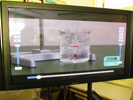 例年であれば、実際に実験して「水を冷やしたとき、水の温度と水の様子がどのように変わっていくのか」を学ぶのですが、感染症予防のためグループ活動を制限しているため実験ができません。そのため、本年度に購入したデジタル教科書を用いて子ども達は学びを深めています。