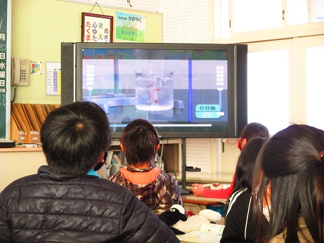 写真はデジタル教科書(動画)で理科実験の様子を見守る子ども達の様子です。