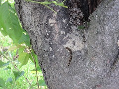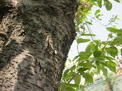 南小のサクラの花びらも、ここ数日の強風ですっかり落ち、葉桜となりました。授業で南門にあるサクラを観察していた子が「先生、毛虫がいっぱいいます!」と職員室に知らせにきました。一緒に確かめに行くと、いるわいるわの大量発生中!10~20匹が集団で幹に集まっている様子は気持ちのいいものではありません。しかし、近くにた子たちは「どこ?どこ?」と木に近づいて探そうとしています。毒がある毛虫では大変ですので、そのサクラの周囲に三角コーンを置き、立ち入り禁止としました。毛虫にとってはかわいそうですが、すぐに消毒してもらいます。