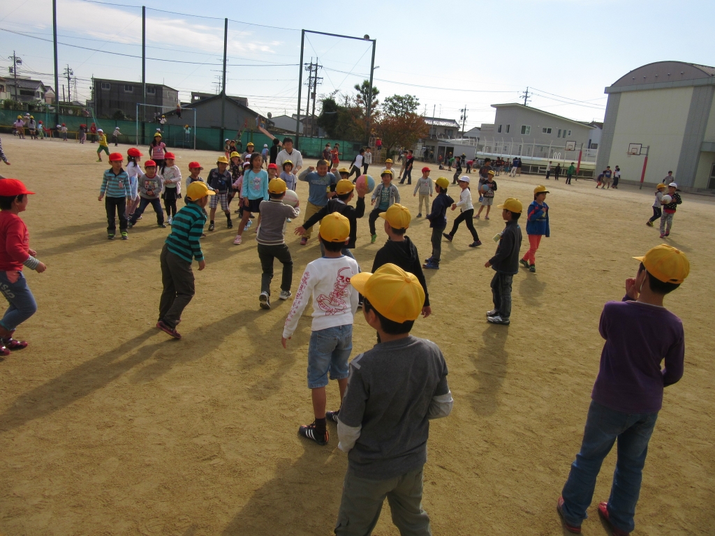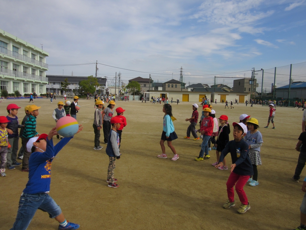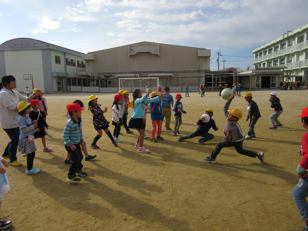 昼休みのはじめは、1年生と3年生が一緒にドッジボールをしていました。そこに「入れて!」と1,2、3年生が次々と参加し始め、最終的に、子どもが40~50人、先生が3人に、ボールも4個というとんでもない巨大ドッジボールになりました。もう外野とかアウト判定もあったもんじゃありません。しかし、子どもたちはとっても楽しそうに遊んでいます。3年生は、柔らかいボールを持ったら下の学年を狙い、固い普通のボールは同学年を狙うよう、仲よく遊べるように考えていたようです。