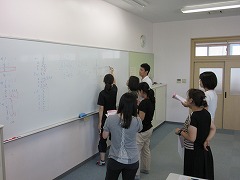 まずは、担任の先生がクラスの特徴をつかみます。同じ学年でも、固さがあるクラスや親和的なクラス、意見を発表するのが苦手なクラスなどがあると分かりました。クラスの分析が終わると、それをホワイトボードに書いてまとめ、南小全体の傾向をつかみました。今回の勉強会の結果を通し、子どもたちのいい面を生かしつつ、足りない部分を伸ばし、よりよい甚目寺南小学校をつくっていきたいと思います。