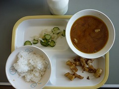 欠席者が多いクラスでは、付け分けられない給食の量も多くなってしまいます。そして、おかわりをしても残ってしまうことがあります。今日の3-3では、新香和えがたくさん残っていたので、食べることができる子を募ってみました。「はい!はい!」と6~7人が応じてくれたのですが、中にはお盆にご飯や豚汁がたくさん残っている子もいました。片付け終了までわずかだったので、その子たちには涙をのんでもらいましたが、残さず食べようという気持ちを嬉しく感じました。