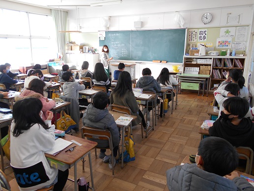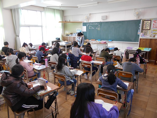 常時換気を行うことで教室の室温は15度程度になってしまいます。そのため子ども達には温かい服装を心がけるように指導しています。また、校舎内での防寒目的の衣服の着用について、柔軟に対応しています(写真のように、教室での上着の着用についても認めています)。