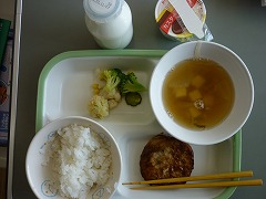 3日の給食は、ご飯、牛乳、エビしんじょ汁、ハンバーグの味噌ソースがけ、彩り花野菜、プリンでした。