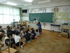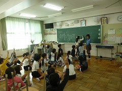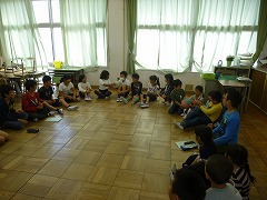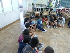 給食終了時に音楽が鳴って、子どもたちが一斉に移動を始めました。3回目ともなると、迷わずに自分の教室へ移動ができるようになっています。4-1ではジェスチャーゲーム、4-2では爆弾ゲームが行われていました。4-1では、リーダーがお題をジェスチャーで次の子に伝えるんだよ、と身振りをつけて低学年に説明するのですが、その子は上手く伝わらずに「ウサギ!!」と答えてしまいました。正確に伝えることは難しいものですね・・・。4-2の爆弾ゲームは、3回爆弾を止めたら罰ゲームというルールです。爆弾(ドッジボール)を持った瞬間にすぐ次の子へ渡す子が多い中、時間を計算してじっと持ち続けている子もいました。