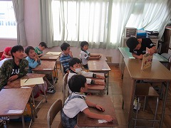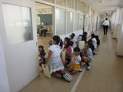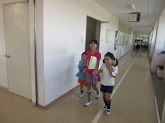 12日は就学時健診です。来年度に入学する新1年生が南小にやってきて、体の検査や簡単なテストをする日です。この日は、5年生と一部の6年生がお世話係として誘導や検査の補助を行いました。