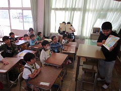 誘導担当は5年生です。担当になった子の手を引いたり、優しく声をかけたりと、さっそくお兄さん、お姉さんぶりを発揮する5年生。初めての場所で不安な気持ちの新1年生にも、徐々に笑顔が見られてきました。中にはすっかりなつかれた5年生もいたようです。順調に進んだ検診でしたが、最後の検査は時間がかる内容です。そのため、待機部屋に80人ほどの新1年生と5年生が待つことになり、我慢できずにしゃべり始めてしまいました。そこで、先生が絵本を読んであげました。すると、新1年生の気持ちが絵本に向いて、静かになりました。その様子を見て、ある男の子が「先生、僕も読んでいい?」と持ちかけ、別の絵本を読んでくれました。(先生の時よりも静かになりました・・・。)しばらくすると、その読み聞かせの様子を見て他の5年生も聞きやすい場所へ移動してくるほどでした。待機時間を上手に過ごしてくれました。