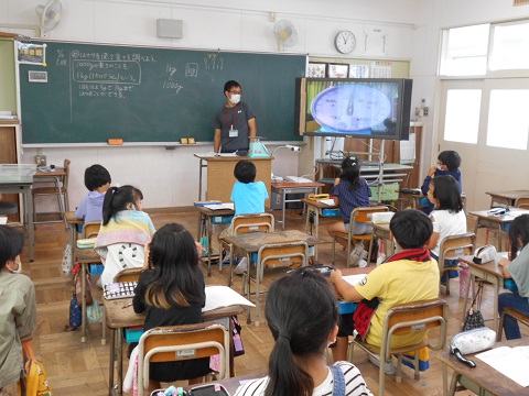 例年ですと、グループに1台はかりを準備して、身近な物の重さを量り、目盛りを読む練習を行っています。本年度についてはグループの活動を減らすため、写真のようにテレビにはかりの目盛りを写して目盛りを読む練習をしました。