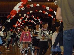 児童会会長からのお祝いの言葉から始まり、1年生の言葉と歌、在校生からは校歌のプレゼント