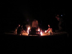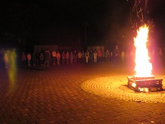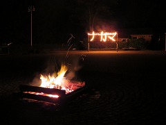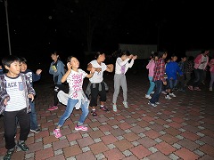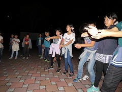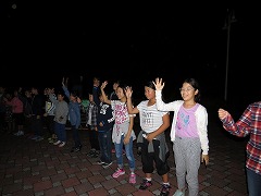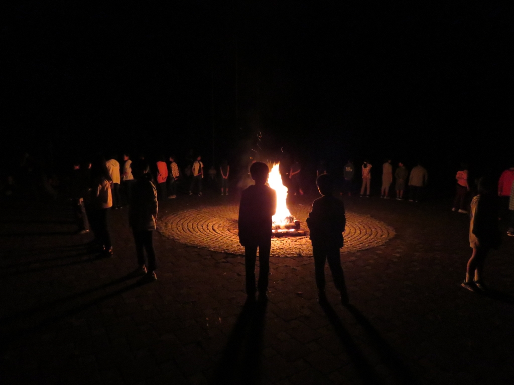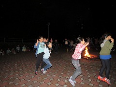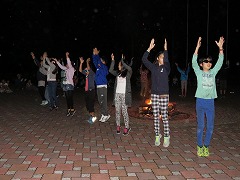 1日目最後のイベントはキャンプファイヤーです。辺りがすっかり暗くなった7時に、火の神が運んだ炎を井げたに点火してファイヤースタート!儀式の厳かな雰囲気と、親睦の和やかな雰囲気のめりはりがあるファイヤーになりました。各クラスの練習の成果を出すダンスや歌は、炎を背にして浮かぶシルエットとなりちょっと幻想的でした。先生(噛みまくり)の進行とキャンプカウンセラーさんたちのゲームで、ファイヤーはさらに盛り上がりました。80分の楽しい時間はあっという間に過ぎていきました。