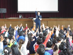 低学年は、おまわりさんのお話でした。 運動場に作られた踏切や交差点を安全に通行しました。