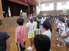 校長先生からは、まず始業式前の入場のしかたについて褒めていただきました。次にオリンピック団体競技での日本人の活躍について話されました。100m走個人では上位に入賞できなくても、陸上男子400mリレーが銀メダルをとった、みんなで協力することのすごさ。そして、体操で金メダルをとった内村選手の何が大切ですか?という質問に対する「すごく努力してきた」という言葉についてです。『協力』と『努力』の大切さを、改めて確認されました。最後は、頑張ったね、すごいね、協力できたねという2学期にできるといいね、とまとめられました。