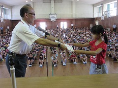 式の最後は校歌で。 作文コンクール入賞です。
