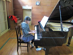 6年生の方を向きながら、横目で指揮者を見て歌います。