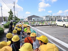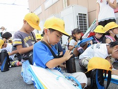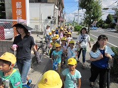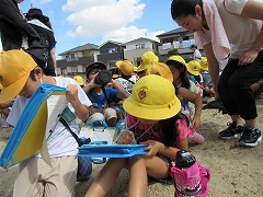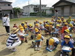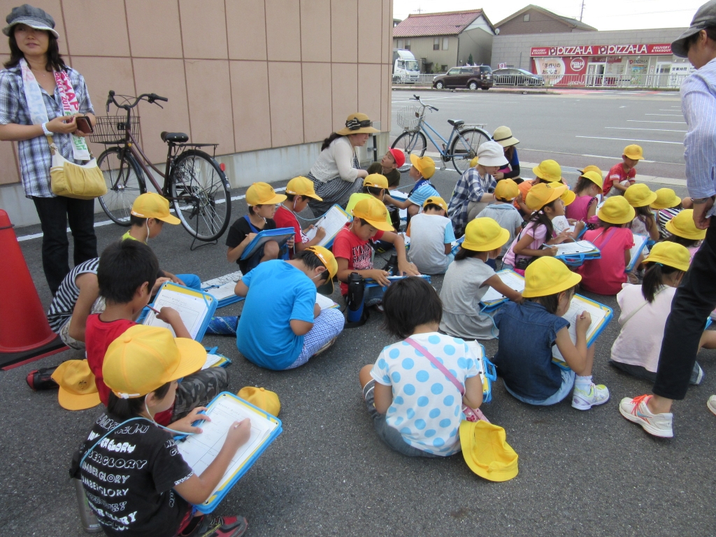 コノミヤ、南児童館、GEOなど、南小の近くにある施設を巡り、気付いたことをメモ用紙に記録します。「ここでカードを買ったよ!(GEOだしね)」「田んぼが見える!(郵便局が後ろにありますが・・・)」「カレー屋がある!(歩道橋から見て)」「あっ、アマガエルだ!(これも町探検?)」近くの友だちといろんな発見を伝え合いながら、子どもたちはメモ用紙に絵を描き、気付いたことを文でまとめました。非常に強い日差しの中、記録&休憩を何度も繰り返し、約80分の町探検は終わりました。