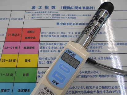 〇 暑さ指数(WBGT)が31℃以上の時には屋外での活動を原則禁止にしています。【右側の写真が測定する機器となります】
