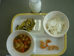 7日の給食は、ご飯、牛乳、ダイコンのそぼろ煮、ひじきと春キャベツのサラダ、小エビの唐揚げでした。