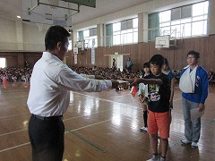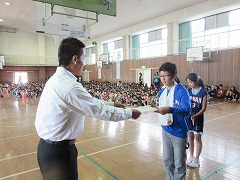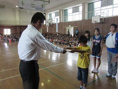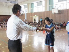 壮行会の後に、後期児童会役員の任命がありました。全校児童選挙で南小をよりよく、楽しくする約束をたくさんしました。児童会役員のチームワークと、一人ひとりの協力で、この約束は果たされていきます。新たな役員のみなさんはもちろん、南小の全ての子が『協力するぞ』という気持ちで、児童会活動に参加してくれるといいな、と思います。期待しています。