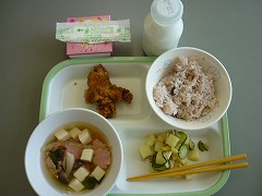 17日の給食は、赤飯、牛乳、春のすまし汁、鶏肉の竜田揚げ、さっぱりサラダ、お祝いデザートでした。