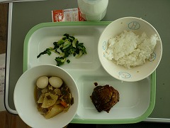 15日の給食は、ご飯、関東煮、サバの味噌煮、ほうれん草の和え物、コーヒー牛乳のもとでした。