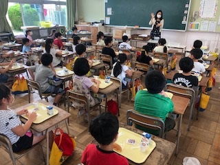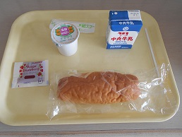 本日より給食が始まりました。本日のメニューは、「米粉パン、いちごジャム、ミカンゼリー、牛乳」です。6月3日(水)から5日(金)まで、パン、牛乳、デザートのみの簡易メニューとなります。