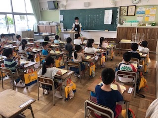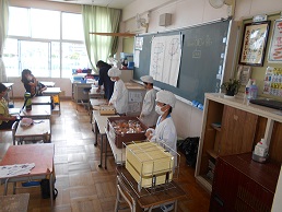 各学級では、配膳台の消毒、手洗い、給食当番の手消毒などをていねいに行っていました。普段グループの形の会食となりますが、新型コロナウイルス感染症の対応で全員前を向いて会話のない食事となっています。