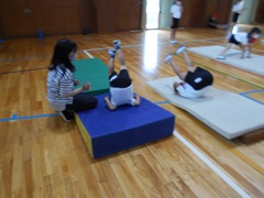 3年生体育 マット運動では、後転のポイントをつかもうと工夫していました。場の設定が変わると感覚が変えられます。