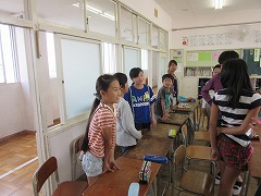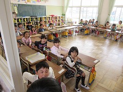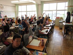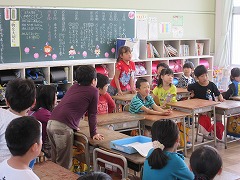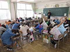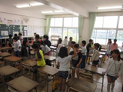 3年生。あいさつの後でハイタッチをして、気分も良くなります。