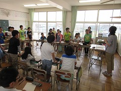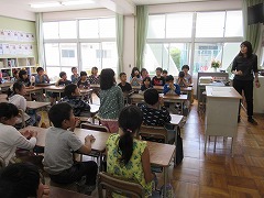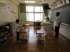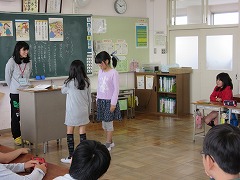 1年生。4組は教室の入り口で「おはようございます!」と、あいさつの印象を確かめました。
