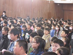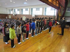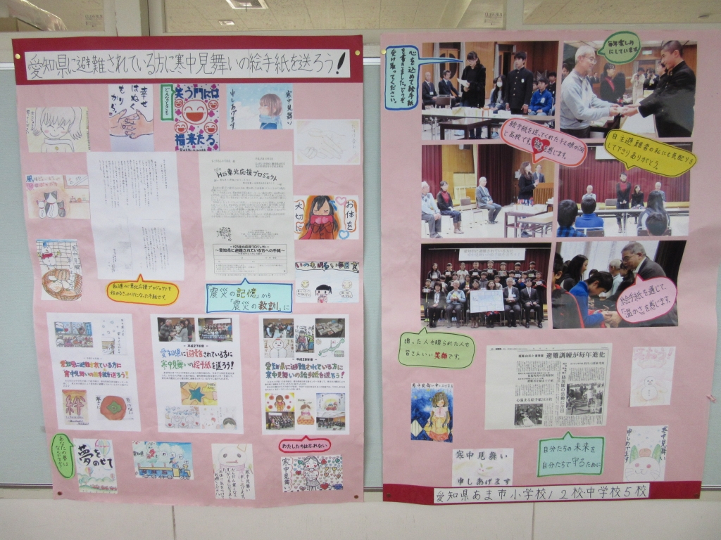 東日本大震災が発生してまもなく6年になろうとしています。しかし、故郷に帰ることができず、この愛知県で生活をしている方々がまだ沢山います。今日は、校長先生から、避難されている方へ絵手紙を送ろうというあま市全体の取り組みに、南小からは6年生と1年生が参加したことが紹介されました。元気を出しとほしいという願いを込めて描いたその絵手紙や活動が評価され、防災甲子園で表彰を受けたそうです。(表彰状はまだ届いていないそうです。)また、描かれた絵手紙や、それを渡す様子が職員室前の廊下に掲示してあることも紹介されました。