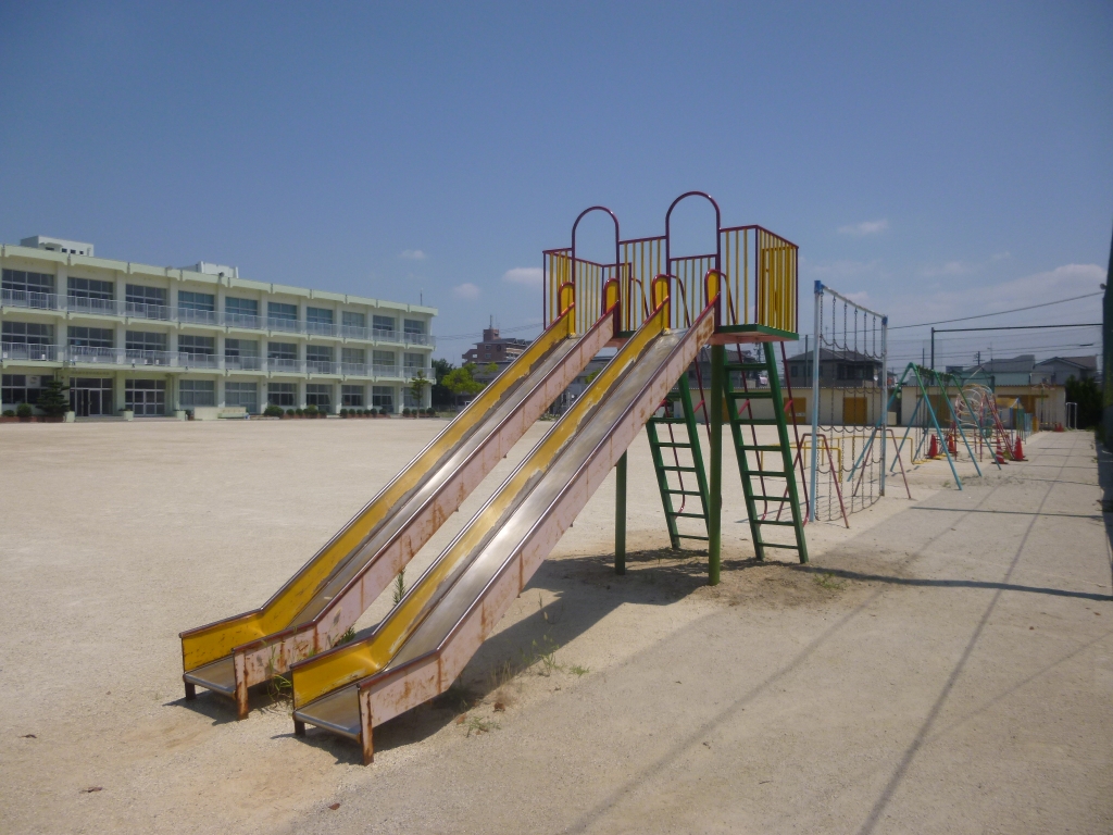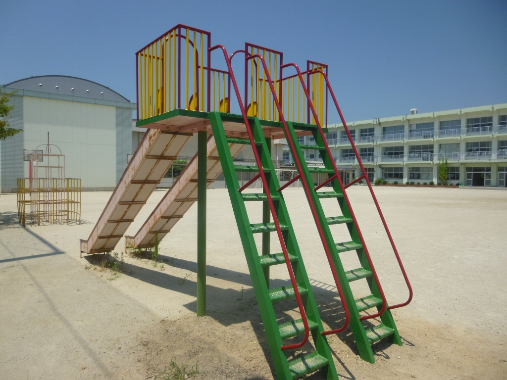 先日、すべり台の修理が終わり、全校出校日の今日は、たくさんの児童が楽しそうにすべり台で遊んでいました。