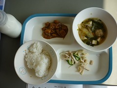 26日の給食は、ネギ鳥丼、具だくさん汁、大根サラダでした。