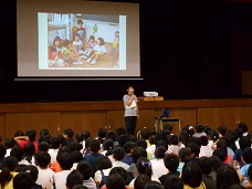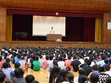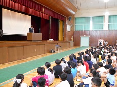 今朝、体育館で臨時朝礼が行われました。校長先生からは、「交通安全に気をつけて夏休みを過ごしましょう」というお話がありました。また、生徒指導担当の先生からは「知らない人にはついて行かない」など、不審者に関するお話がありました。