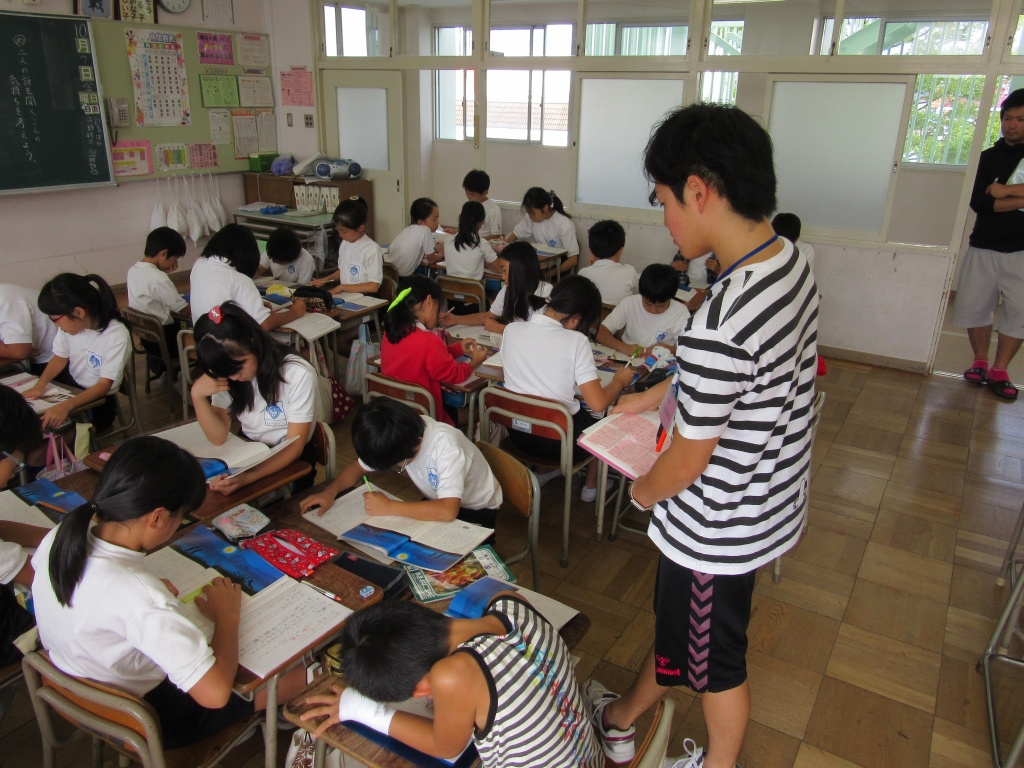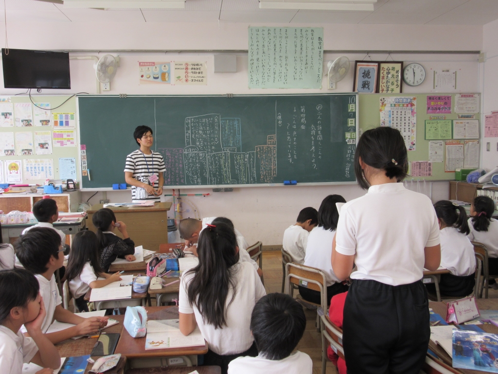 教育実習生がやってきて2週間が経ちました。若く元気のある4人と子どもたちが、休み時間に運動場で一緒に遊ぶ姿がよく見られます。また、実習生の担当クラスでは、授業を行ったり給食を子どもたちと一緒に食べたりもしています。