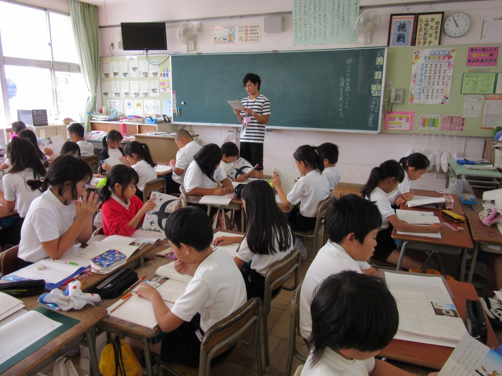 4-3では3時間目に『ごんぎつね』の授業を実習生の先生にしていただきました。先生の後に続いて音読、ごんの気持ちを考える、考えたことを他の子と情報交換して様々な考え方を知る、まとめる、という順で学習は進んでいきました。慣れない授業を一生懸命行う実習生と、発問に対する答えを必死に考える子どもたち。みんながいつも以上に頑張っていた4-3でした。