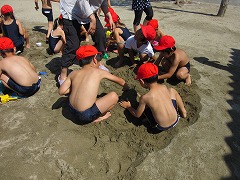数人でグループを作り、砂場をこね始めました。最初のうちは、山を作ってトンネルを掘ったり、水をくわえてお団子を作ったりしていましたが、やがて、池ができ、川ができ、みんなで作った砂の王国が完成しました。楽しい時間は終わり、砂場を元に戻して片付けると、ホースの水で砂を落とし、シャワーで体を念入りに洗ってプールに入りました。