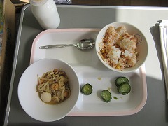 2日の給食は、鮭チャーハン、八宝菜、キュウリの香り漬け、ひとくちゼリー(みかん)でした。
